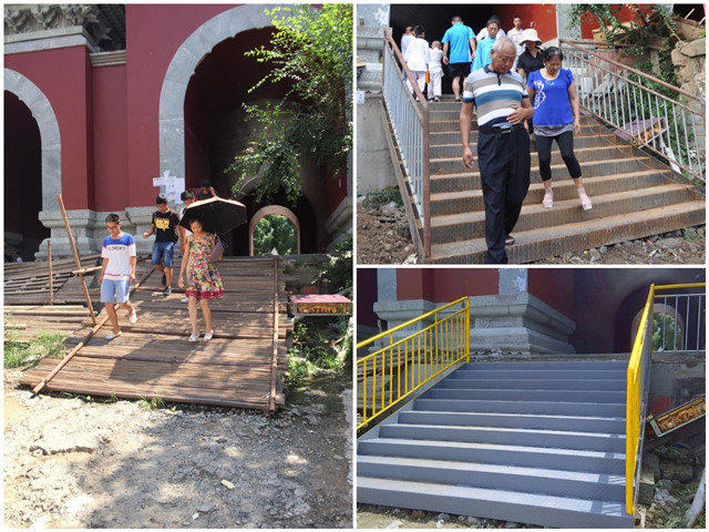 “洞子口”是武當(dāng)老百姓對玉虛宮鐵路涵洞的俗稱,這也是玉虛宮與武當(dāng)山步行街連接的唯一人行通道。2013年至今,經(jīng)過3年多漫長施工,玉虛宮鐵路涵洞仿古建工程基本竣工,但唯獨步行街一側(cè)行人臺階遲遲未建,一直使用臨時竹排代替石梯供行人通行,給居住在玉虛宮涵洞以南居民以及游客出行帶來極大不便,特別給老人、孩童出行造成更大困難,時常有路人在此摔倒受傷。