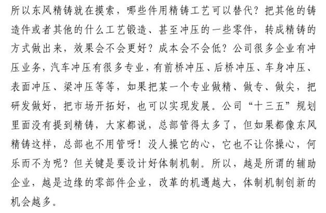 希望全體員工,進(jìn)一步轉(zhuǎn)變觀念,充分履職盡責(zé),積極參與國(guó)家、東風(fēng)和公司新一輪改革浪潮,為東風(fēng)精鑄“新A8”事業(yè)計(jì)劃達(dá)成貢獻(xiàn)力量。