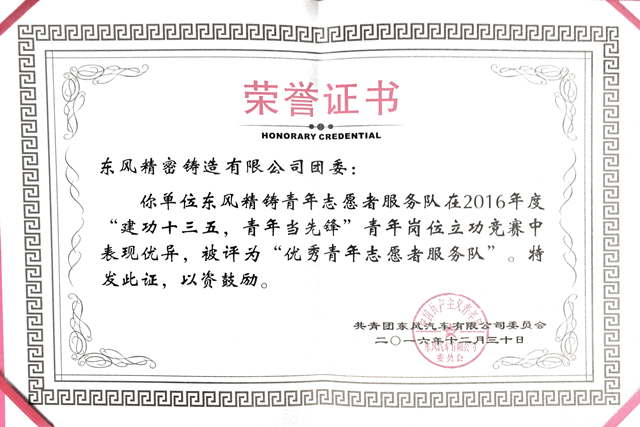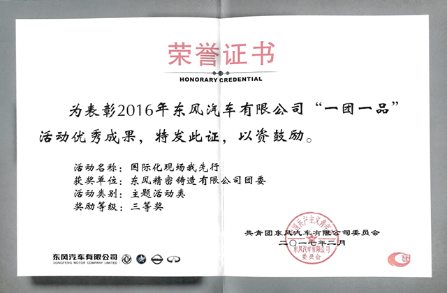 2016年度,東風(fēng)精鑄團(tuán)委積極開展“一團(tuán)一品”創(chuàng)建活動(dòng),經(jīng)年初立項(xiàng)、過程實(shí)施、成果總結(jié)、申報(bào)及上級(jí)單位評(píng)定等環(huán)節(jié),東風(fēng)精鑄團(tuán)委“國際化現(xiàn)場我先行”主題活動(dòng)榮獲東風(fēng)汽車有限公司“一團(tuán)一品”三等獎(jiǎng)。并且在2016年度“建功十三五,青年當(dāng)先鋒”青年崗位立功競賽活動(dòng)中,東風(fēng)精鑄團(tuán)委帶領(lǐng)團(tuán)員青年立足崗位、積極作為、勇于擔(dān)當(dāng),被評(píng)為“東風(fēng)汽車有限公司優(yōu)秀青年志愿者服務(wù)隊(duì)”及 “東風(fēng)汽車公司優(yōu)秀青年志愿者服務(wù)隊(duì)”。